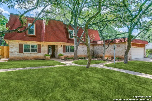 Nestled beneath a canopy of towering, mature oak trees on a beautifully shaded lot, this stately residence in the highly sought-after Whispering Oaks neighborhood offers timeless charm paired with modern luxury. Seller has made the large investment of updating the kitchen AND all bathrooms with high end finishes so you can enjoy! With an expansive and versatile 5-bedroom floorplan, including a separate mother-in-law suite, this home provides generous space for multi-generational living, guests, or a private office setup. Enjoy multiple living spaces including a bonus room complete with a wet bar, and a sunroom equipped with custom motorized Hunter Douglas shades. Additional highlights include hardwood floors, a central vacuum system, newer windows, a newer roof, and a custom shed ensuring peace of mind and long-term value. Step outside and enjoy unbeatable neighborhood amenities-just a short walk to a heated pool with slide, tennis courts, pickleball courts, and playgrounds. And for your convenience, Alon Town Centre is only 3 minutes away, offering an HEB, shopping, dining, and more. Easy access to the airport and medical center. This is the perfect opportunity to own a beautifully updated home in a prime location-schedule your private showing today!